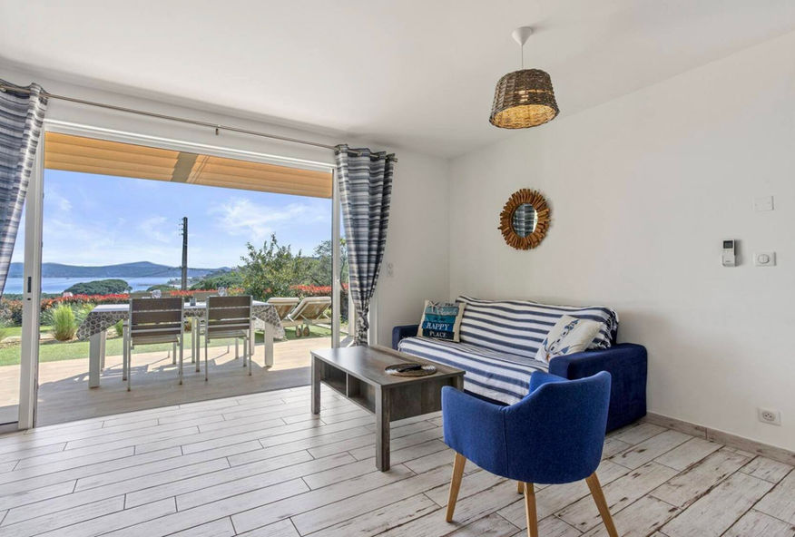 L'appartement " MER " est situé plein SUD au RDC de la villa, il fait une superficie de 60M2 avec une terrasse privative de 16M2 avec vue mer sur le Golfe de Saint Tropez.